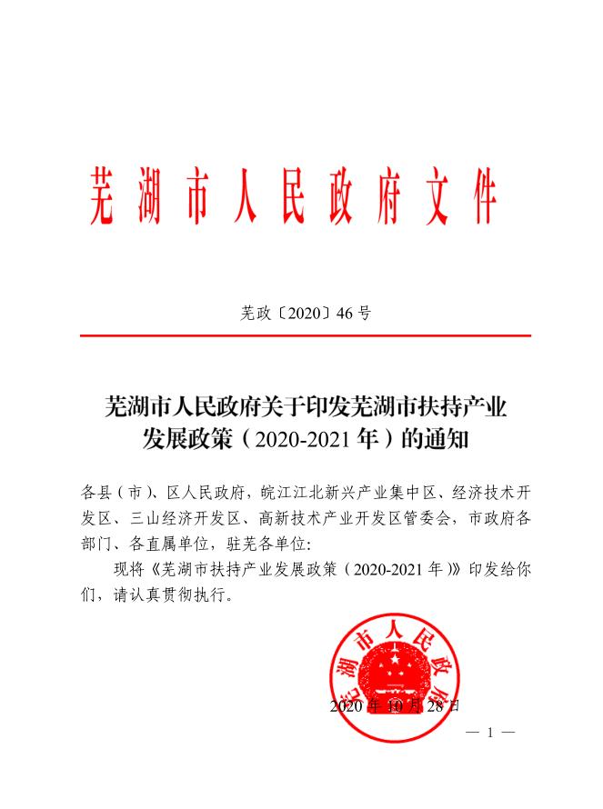 蕪湖市人民政府關于印發蕪湖市扶持產業發展政策(2020-2021年)的通知
